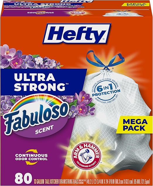 - Hefty Ultra Strong 13 Gallon Trash Bags offer durability, puncture resistance, and odor control for everyday use.
