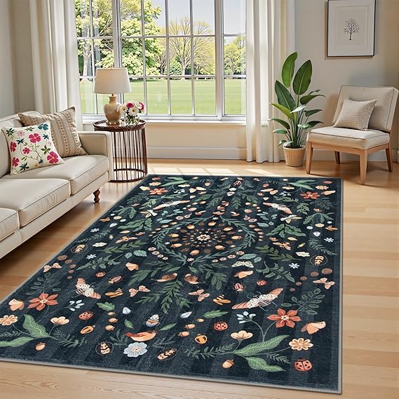 - Lanffia 5×7 black floral rug with insect pattern, stylish, soft, and perfect for bedroom decor.